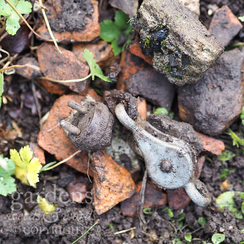 Scratch the surface of my garden, and all manner of foreign objects begin to reveal themselves. When I first laid out the beds I discovered, barely a spit deep, a 2 metre square patch of glass sheeting, as if someone had flattened a greenhouse and then turfed it over. Fertile ground for crunching and swearing but ultimately, when efforts to extract the glass proved futile, I resolved to plant through the shattered panes and exercise extreme caution when working in the vicinity. This morning’s weeding turned up, in addition to the bucket load of crushed brick that even the most casual cultivation invariably disinters, a small pulley block and an old Bakelite plug. I’ve yet to discover anything remotely useful or interesting but, since in wishing for that I fear I’d be tempting Fate to provide me with a body to exhume, I think I’m ok with things as they stand.