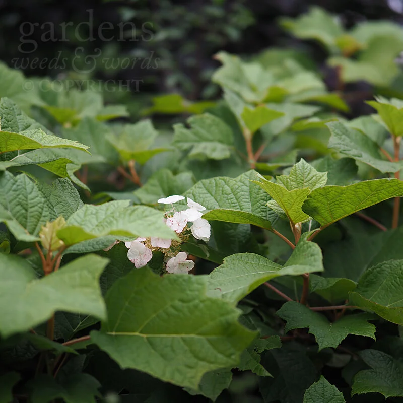 The oak-leaved hydrangea (Hydrangea quercifolia) is big on leaves this year, but less so on flowers, which is interesting, given that I had cause to mention that its black-stemmed cousin Zorro (Day 231) was doing something not altogether dissimilar a few days ago. While it’s not a trend I’m keen to see continue, it’s not overly concerning seeing that, arresting as the creamy white panicles are, it’s really the foliage on this character that’s the standout feature. This is the very picture of vigour and health just now, a new pair of deeply veined and lobed leaves emerging almost every day, and promising – always assuming that the autumn turns obligingly cool – a fabulously fiery display in a couple of month’s time.